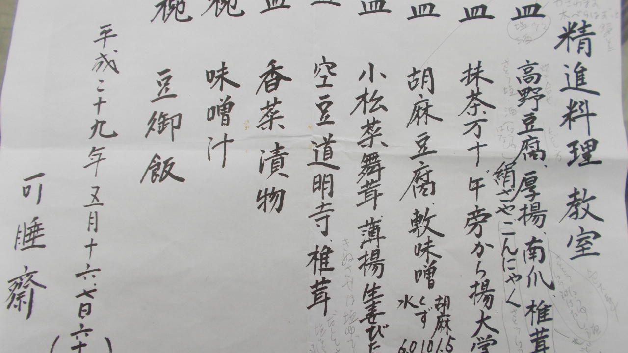 精進料理教室に行ってきました!! 2017年05月21日 静岡県袋井市にある秋葉総本殿 可睡斎にて精進料理を習ってきました! 「本日の献立はありますがレシピはありません、見て、感じて覚えてください!」と先生である泰玄さんのお言葉。 コツといいますか、煮物にしても素材の持つ色や風味を大切にして、そのものの味を生かす煮方を見せて頂きました。 精進料理といえば「ごま豆腐」 今まで作り方を考えたことがなかったですが、凄い手間がかかっていることに感動いたしました! 大鍋でかき回すことこと40分位かな水分がなくなってとろとろになるまでみんなで交代して、最後の仕上げ」は先生! ごま豆腐・・・美味しかった~(^^♪