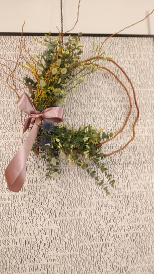 春のリース作ってみました 2023年02月23日 先日お休みの日にフラワーアレンジメント教室に行ってきました! 今回は「枝物を自由に使ってリースを作ってみよう!」ということで長い”ドラゴン雲龍柳”を二重に巻いて 環を作ってミモザアカシア、ラグラス、エリンジューム、ユーカリ、ハイブリットスターチスなどを花束にして結束バンドで留めて可愛いリボンを付けました!いかがですか(^^♪
