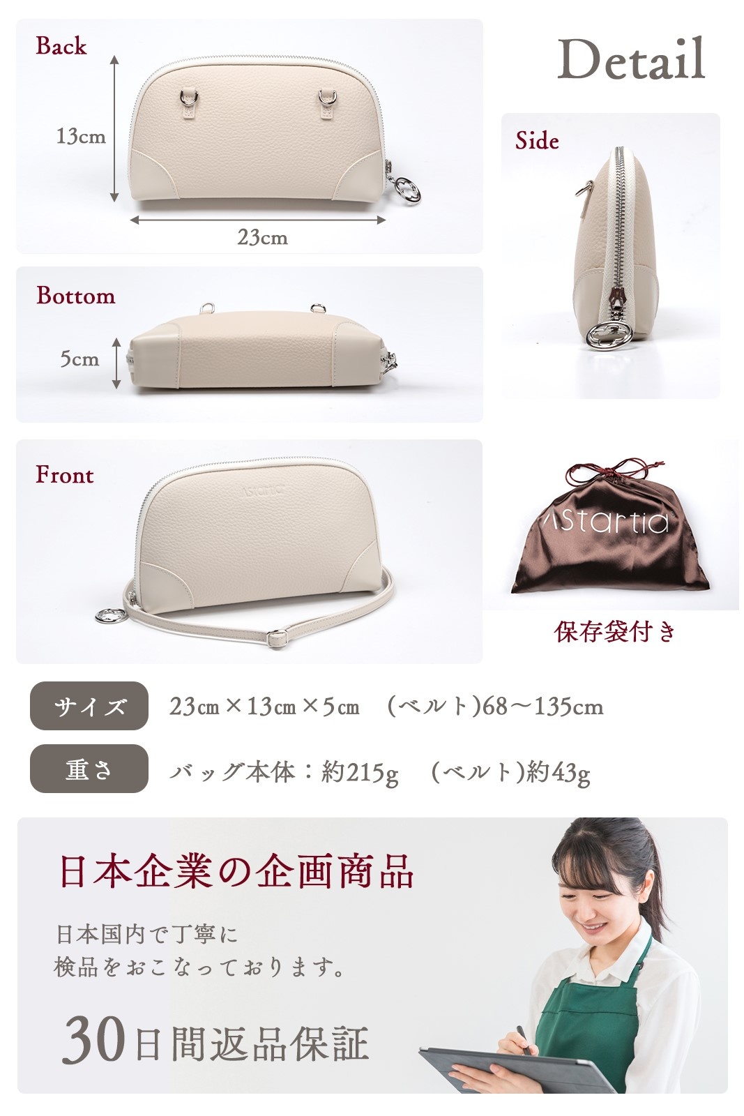 【上質なシュリンクレザーを贅沢に】柔らかな本革にシボ目をつける「シュリンク加工」を施しました。キズを目立たせず一層上品な質感に。ストラップと底の両端は丈夫な牛革の内側部分を使用し、補強しながらデザインのアクセントにしています。上品なレザーの質感と装飾のないシンプルはデザインで大人可愛く、また、シンプルな服装の日はポイントになります。日本人の体型や用途にピッタリ。【理想のギフト】実用性とデザイン性を兼ね備えたこのお財布ショルダーは、あらゆるシーンで活躍。自分へのご褒美や、友人・家族へのプレゼントにも最適です。