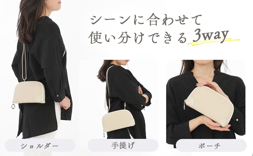 商品説明【3WAYスマホお財布ショルダーバッグ】ストラップ取り外し可能。【斜め掛け】【肩掛け】【ポーチ】の3通りに使えます。札入れとしても使えるポーチは、斜め掛けや肩掛けは、もちろん、ストラップを外せばクラッチや財布としてもお使いいただけます。本体225gの軽さでシンプルで。スッキリとしたデザインながら、必要最低限な持ち歩きに活躍。お出かけカバンが要らず、お出かけが楽しくなります。軽量設計で、長時間の使用でも快適です。