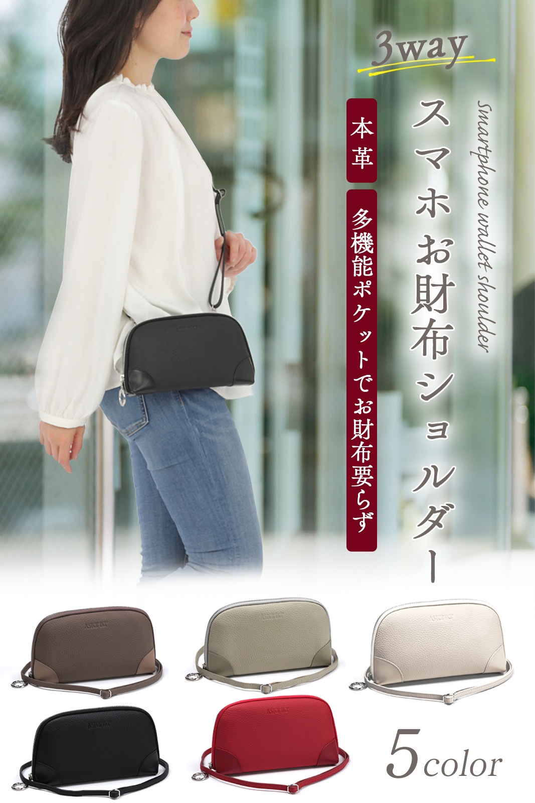商品説明【3WAYスマホお財布ショルダーバッグ】ストラップ取り外し可能。【斜め掛け】【肩掛け】【ポーチ】の3通りに使えます。札入れとしても使えるポーチは、斜め掛けや肩掛けは、もちろん、ストラップを外せばクラッチや財布としてもお使いいただけます。本体225gの軽さでシンプルで。スッキリとしたデザインながら、必要最低限な持ち歩きに活躍。お出かけカバンが要らず、お出かけが楽しくなります。軽量設計で、長時間の使用でも快適です。